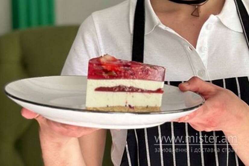 Десерт на пісочній основі. До складу входить: сиркова маса з додаванням желатину, верх – на основі желатину із зблендерованою малиною та м`ятою.