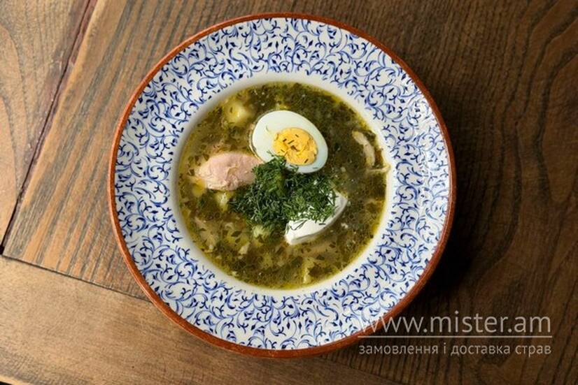 Борщ з щавлю та кропиви з курячим м`ясом. Подається зі сметаною.