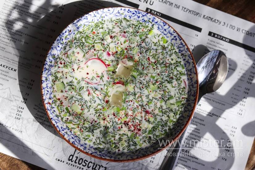 Редиска, свіжий огірок, відварене філе індика, яйця, зелена цибуля, кріп. Заливка з айрану, мінеральної води, сметани, майонезу та гірчиці.