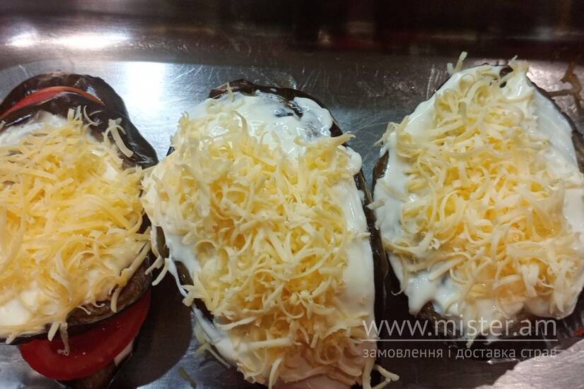 Баклажани обсмажені кільцями, запікаються з помідорою, майонезом і сиром.