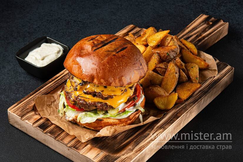 Соковита булочка бріош з соусом дорблю, 2 котлети яловичі, помідор, руккола, цибуля карамелізована, огірок маринований, сир чедер, масло часникове, картопля по-селянськи з соусом тартар.