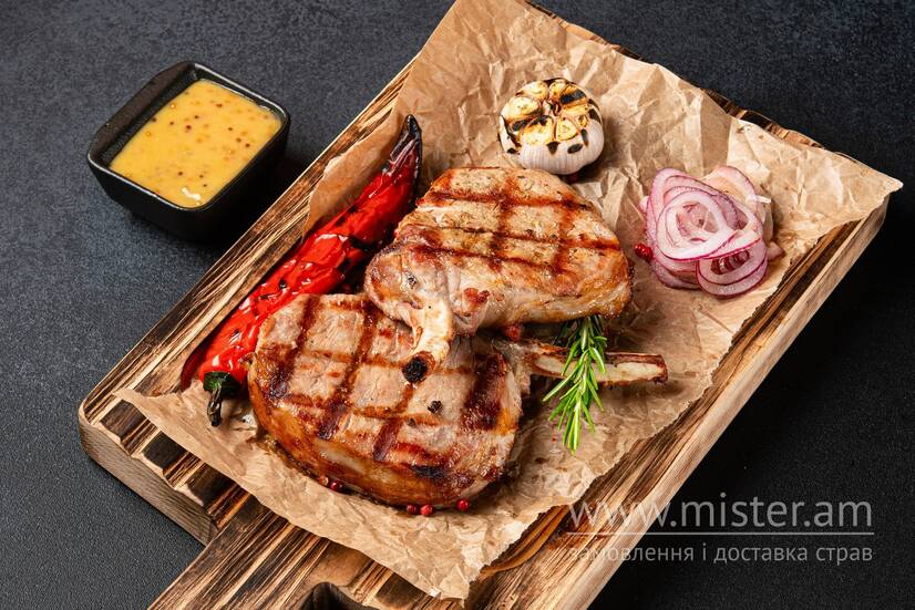 Свинна корейка, розмарин, цибуля синя маринована, зелень, перець чилі (ціна вказана за 100 г сирого продукту, підготовленого до смаження).