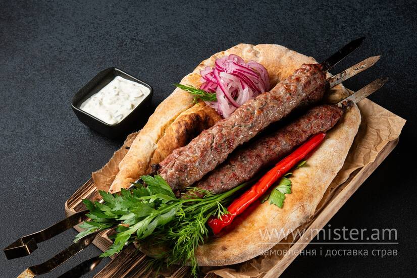 Кебаб з яловичого та свинного фаршу, цибуля маринована, зелень - ціна вказана за готову страву.