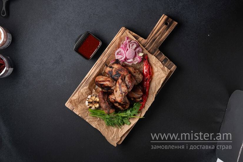 Шашлик з свинного ошийка, цибуля синя маринована, зелень, перець чилі (ціна вказана за 250 г сирого продукту, підготовленого до смаження).