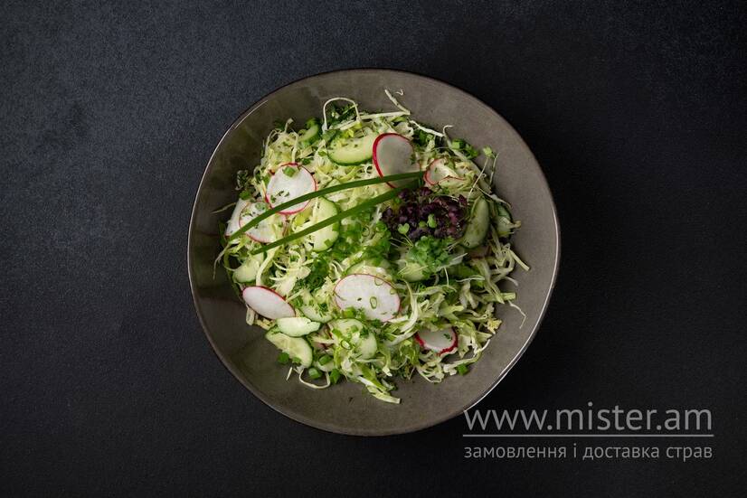 Молода капуста, огірок, кріп, олія, лимонний сік.