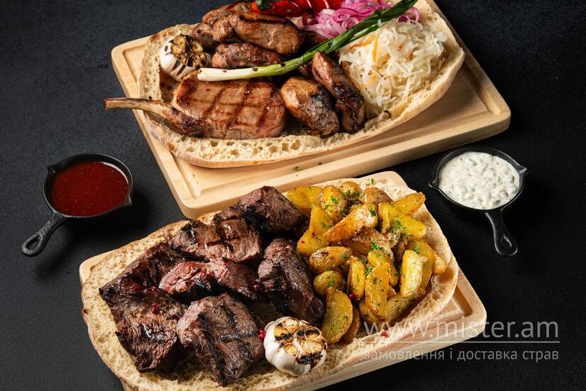 Свинний ошийок - 200 г, люля-кебаб з яловичини - 240 г, корейка - 160 г, шашлик з телятини - 160 г, картопля запечена - 290 г, цибуля синя - 100 г, морква запечена - 140 г, буряк запечений - 140 г, морква по-корейськи - 100 г, капуста квашена - 100 г, цибуля маринована - 100 г, перець чилі - 20 г, соус Медово-гірчичний - 60 г, соус Аджика - 60 г, часниковий соус - 60 г.