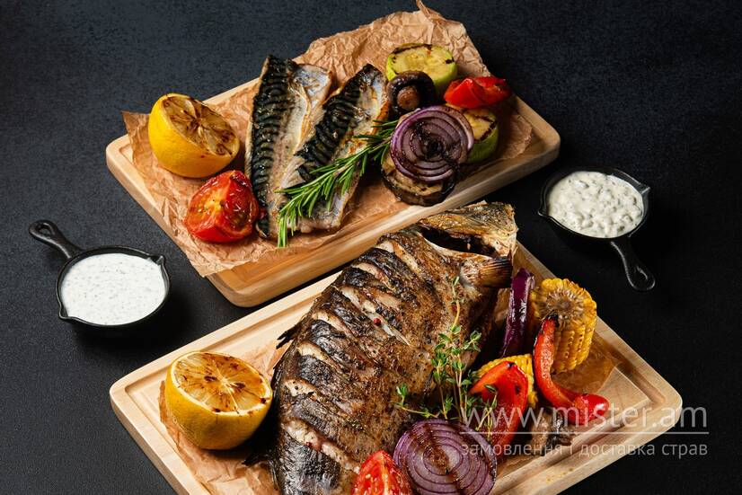 Короп маринований - 600 г, скумбрія маринована - 342 г, картопля запечена - 290 г, цибуля синя - 100 г, морква запечена - 140 г, буряк запечений - 140 г, морква по-корейськи - 100 г, капуста квашена - 100 г, цибуля маринована - 100 г, перець чилі - 20 г, соус Тар тар - 60 г, соус Сметанковий - 60 г.