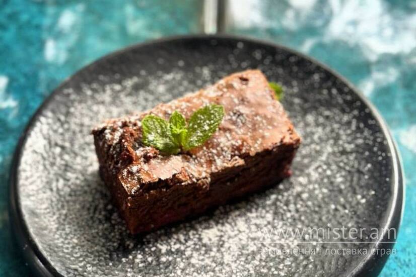 Шоколадний брауні з вишнею та ванільним соусом