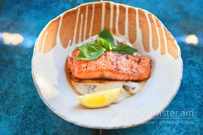 Стейк з лосося на подушці з печериць