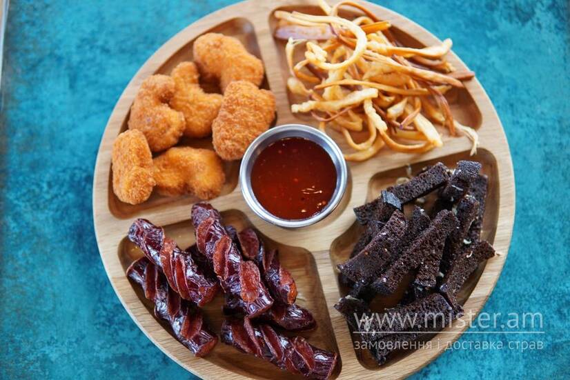 Мисливські ковбаски, нагетси, сир косичка у фритюрі, гріночки з часником та сиром, солодко-гострий соус.