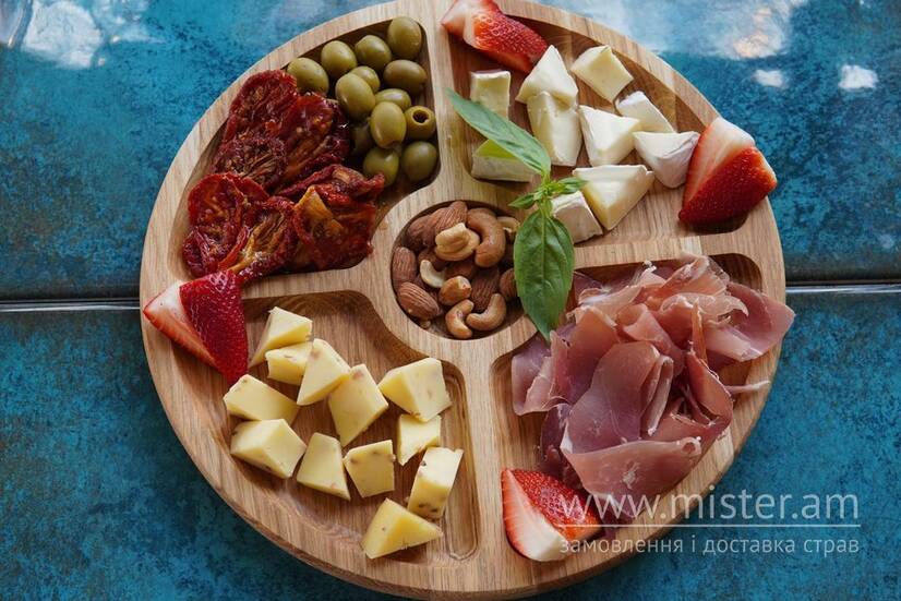 Сир з горіхами, сир Брі, прошуто, в`ялені томати, оливки, горішки.