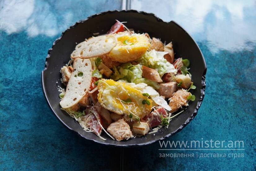 Айсберг, чері, куряче філе, яйце в паніровці, пармезан, гріночки з багету та соус Цезар.