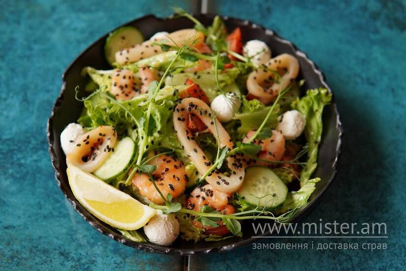 Листя салату, огірок, помідори чері, туби кальмару,креветка тигрова, крем сир та універсальна заправка.