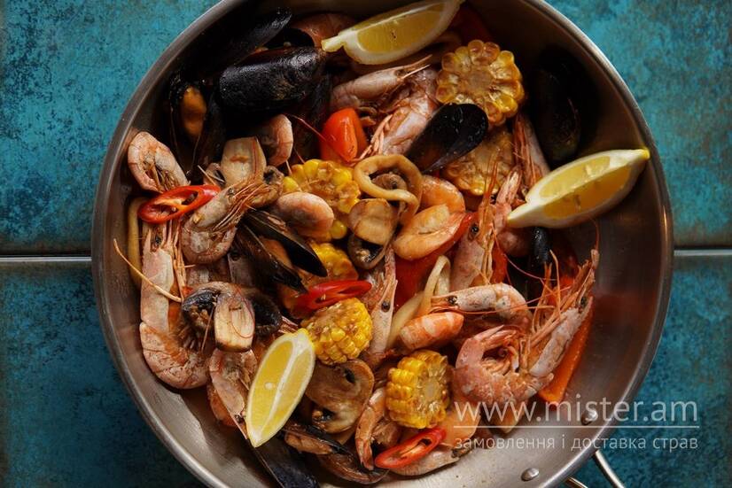 Креветка тигрова, креветка Королівська, мідії в мушлях, туби кальмару, креветка канада, кукурудза, болгарський перець, печериці та лимон.