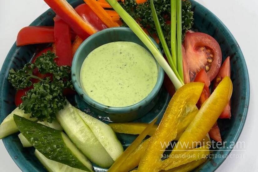 Огірки, помідори, перець болгарський, морква, цибуля зелена, соус тар-тар.
