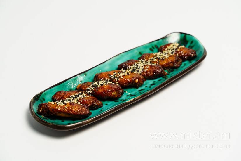 Курячі мариновані крильця, смажені у фритюрі, заправлені соусом барбекю.