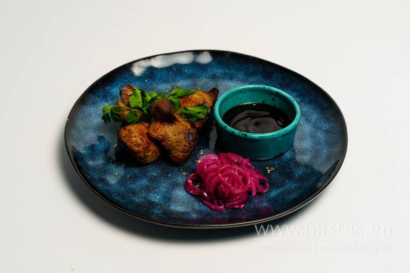 Шашлик зі свинної шиї з соусом BBQ, маринованою синьою цибулею та зеленню.