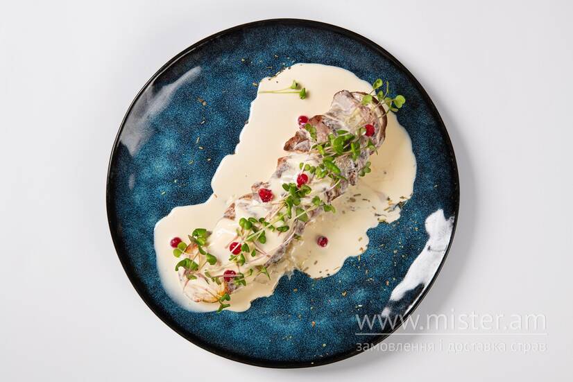 Запечена картопля зі свинною вирізкою, сиром Пармезан під сирно-вершковим соусом.