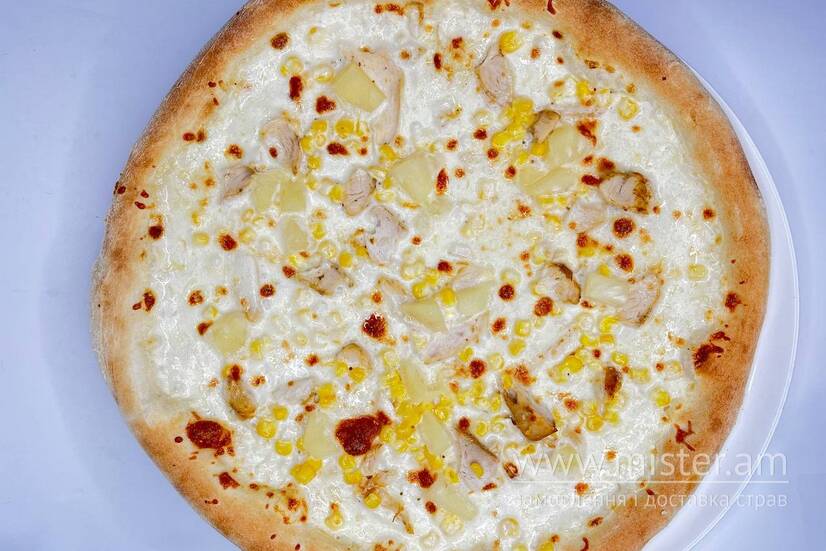 Печене куряче філе, ананас і кукурудза консервовані, сир моцарела, вершки.