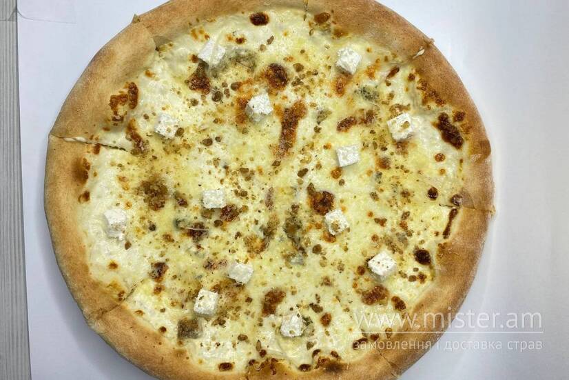 Сир Дор Блю, сир фета, пармезан, моцарела, карамелізований грецький горіх, вершки.