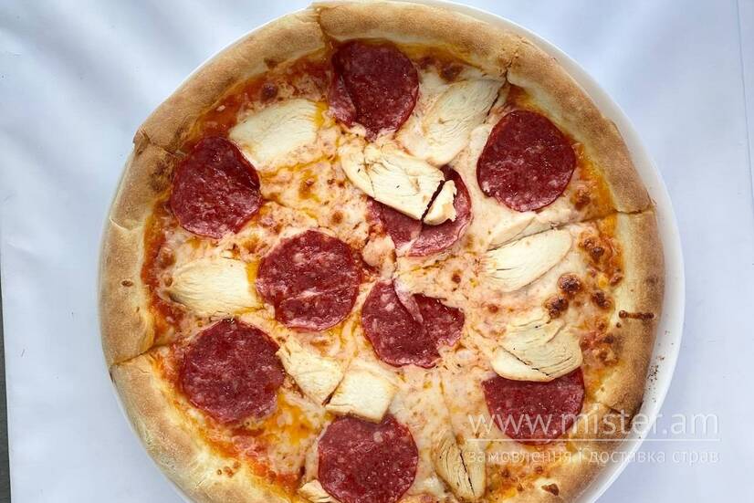 Філе курки, ковбаска салямі, сир моцарела, соус помідоровий.