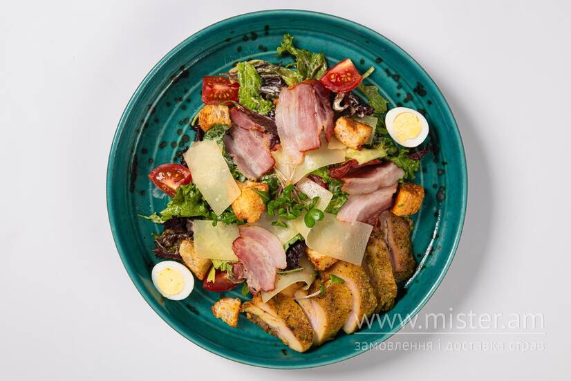 Листя салату, помідор чері, крутони, перепелині яйця, сир пармезан, смажене куряче стегно, бекон, соус цезар, мікрогрін.