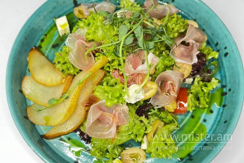 Листя салату, оливки, томати чері, прошуто, сир Дор блю, карамелізована груша, зелена олія, заправляється соусом на основі меду та цитрусового фрешу.