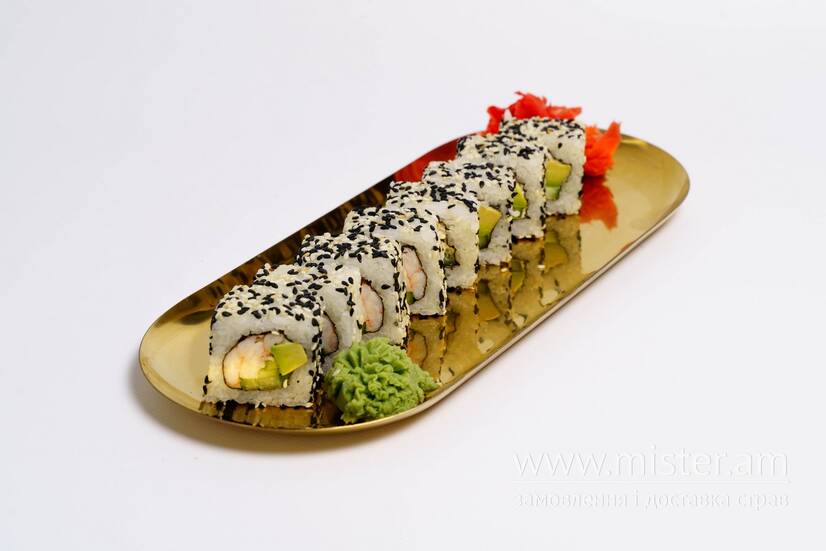 Креветка, майонез, огірок, авокадо, норі, рис, мікс кунжуту чорного і білого.