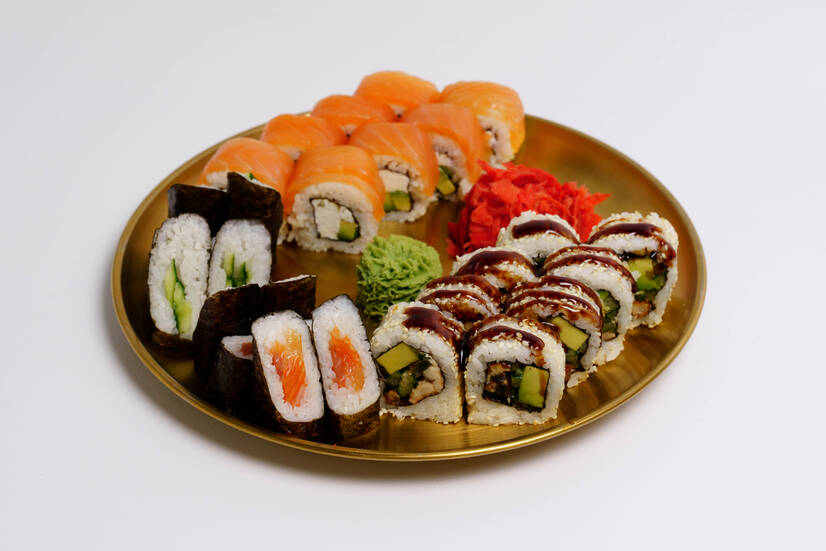 Філадельфія з лососем, Каліфорнія з вугрем, макі з копченим лососем, макі з огірком.