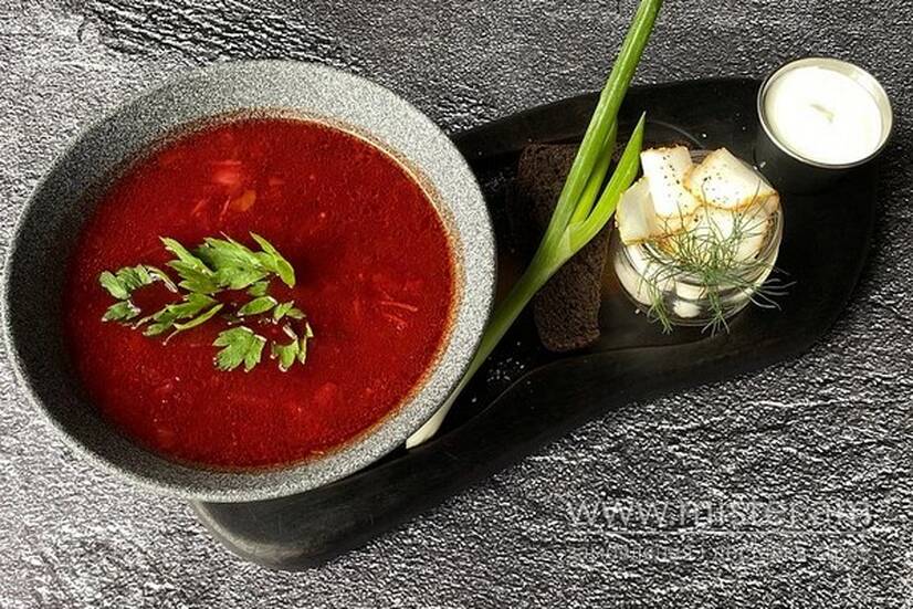 Подається з салом, сметаною, цибулею та грінками.