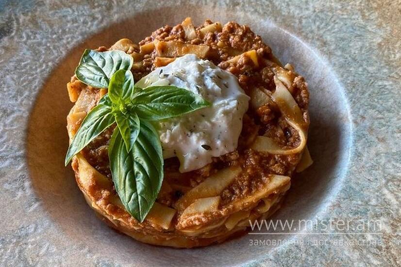 Соус болоньєзе, сир страчателла, базилік.