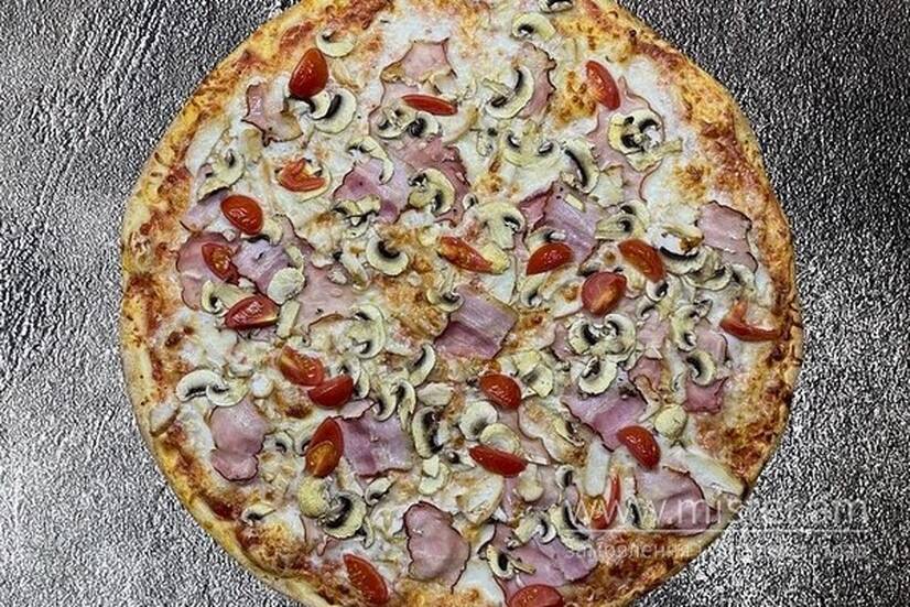 Моцарела, шинка, бекон, курка, печериці, помідори чері.