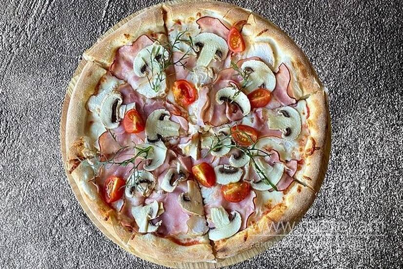 Моцарела, шинка, бекон, курка, печериці, помідори чері.