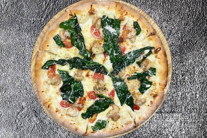 Вершковий соус, креветки, шпинат, часник, пармезан, помідори черрі, моцарелла.