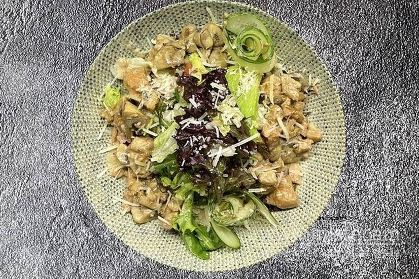 Томати черрі, лосось, печериці, мікс салату, салат Айсберг, огірок, пармезан, майонез, соєвий соус.