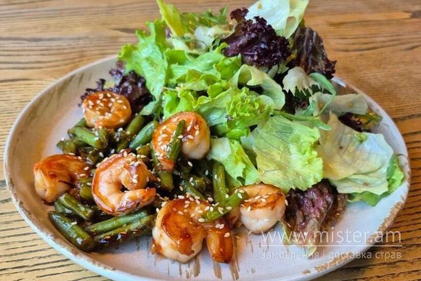 Мікс салату, креветки, спаржа, соус діжонський, кунжут.