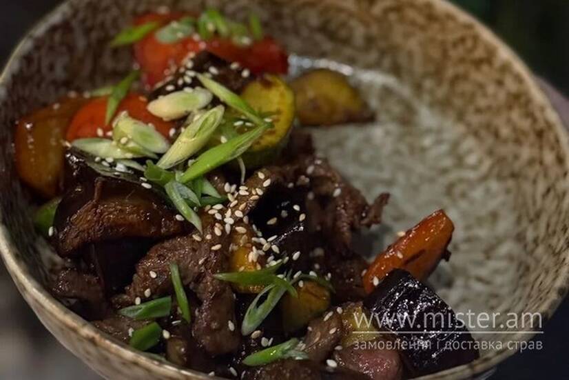 Болгарський перець, помідор, кабачок, телятина, баклажан, устричний соус.