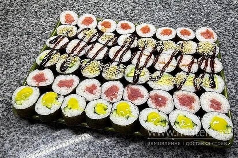 Макі з лососем, макі з креветками, макі з вугрем, макі з тунцем, макі з огірком, макі з авокадо.
