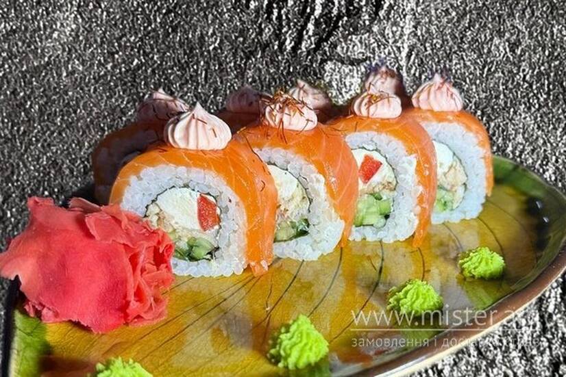 Рис, норі, огірок, крем‑сир, болгарський перець, лосось, копчений вугор, майонез, ікра масаго.
