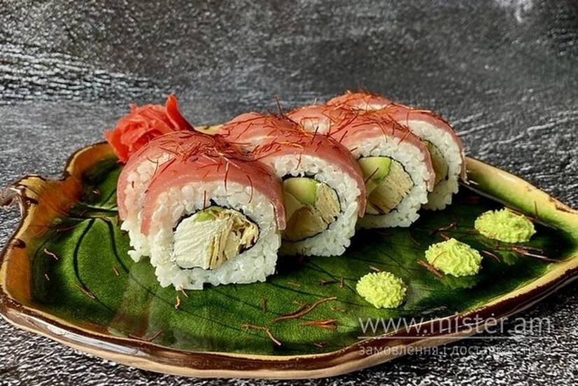Рис, норі, крем‑сир, омлет томаго, авокадо, тунець.