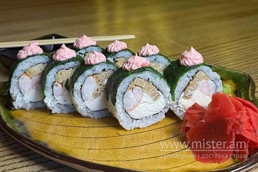 Рис, крем-сир, норі, креветки, омлет томаго, шпинат, майонез, ікра масаго.
