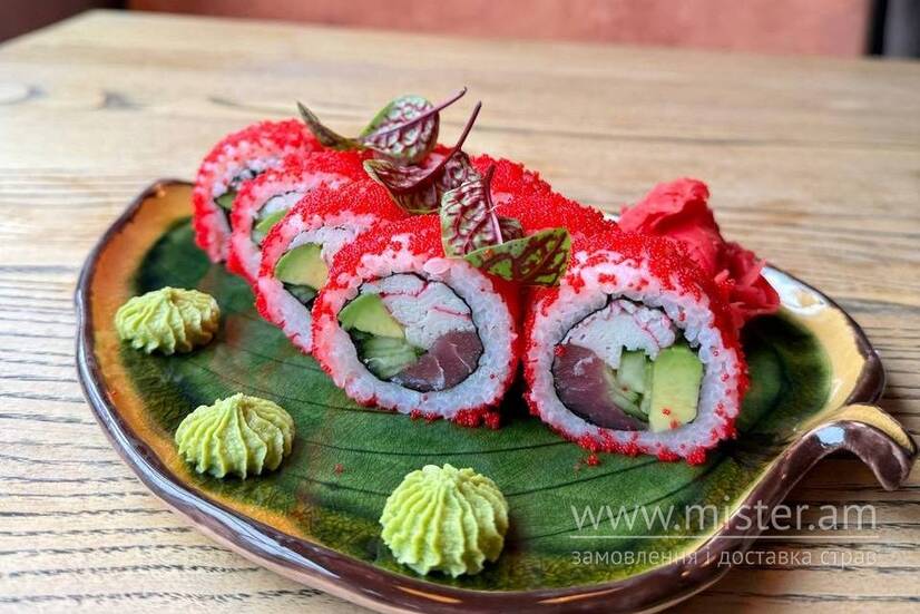 Рис, норі, крем-сир, тунець, сніжний краб, огірок, авокадо, ікра томаго.