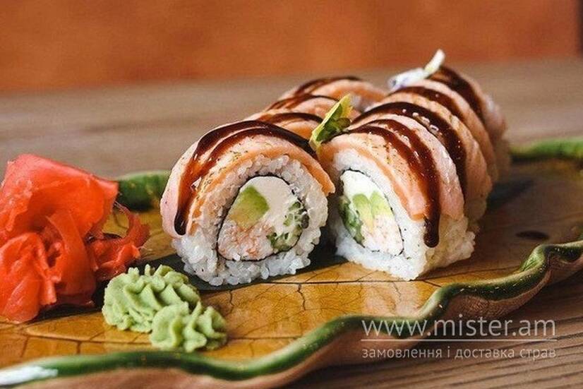 Рис, норі, крем-сир, сніжний краб, огірок, авокадо, лосось обпалений, соус унагі.