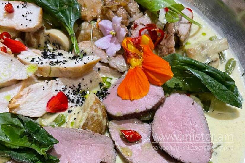 Три види м`яса - розтбіф, м`ясце зі свиного ошийка, філе куряче гриль. Подається з овочами на вершковому соусі.