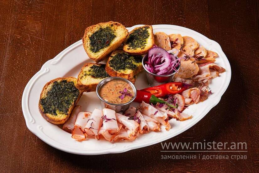 Нарізне сало з часником, булочками бріош і гірчичним соусом.