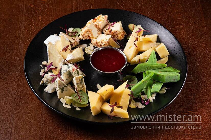 Сири Брі, Дор блю, Грюнвальд, песто, з трюфелем та лавандовий, мигдалеві пластивці, мед з сиропом гренадин.
