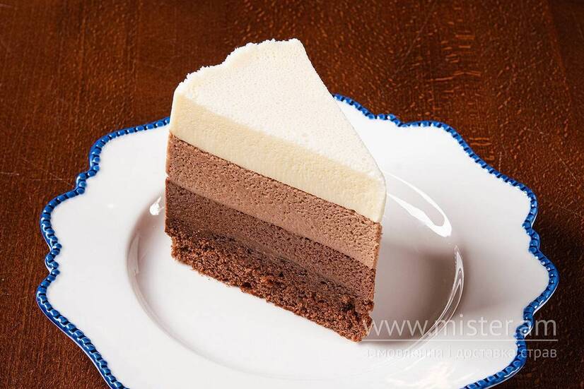 Шоколадний бісквіт, муси з білого, молочного та чорного шоколаду.