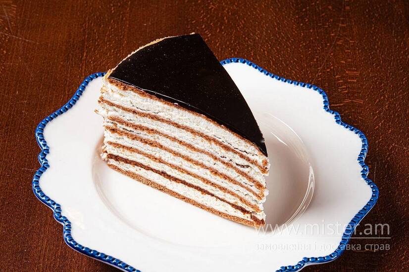 Шоколадно-медові коржі та 6 шарів крему на основі домашньої сметани.