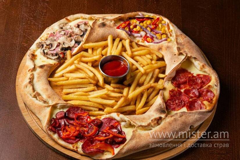 4 сектори піци з різними начинками, картопля фрі, червоний соус.