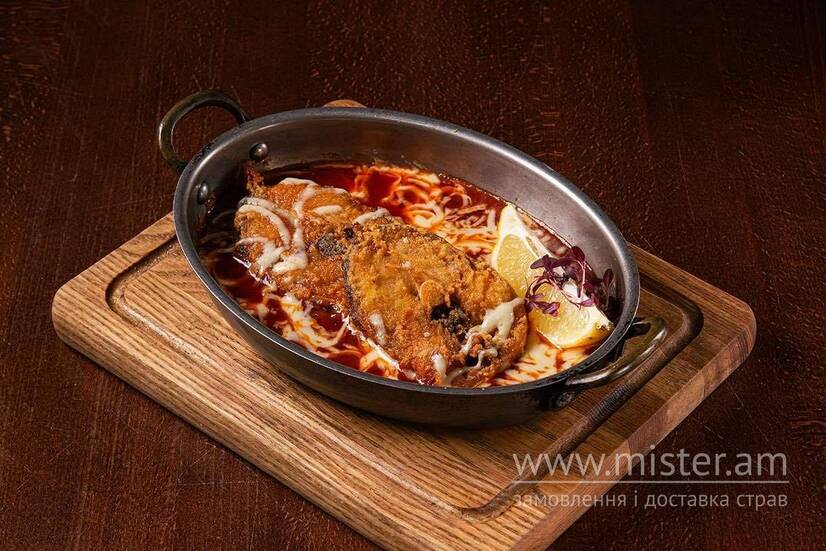Креветочна риба, запечена у томатах з сиром Моцарелла